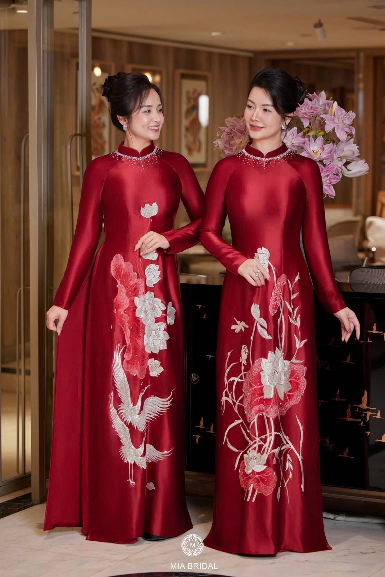 Áo dài bà sui lụa đỏ đô thêu hoa – hạc là lựa chọn hoàn hảo cho những gia đình mong muốn hình ảnh trang trọng, sang trọng và đúng chuẩn lễ nghi, góp phần tôn vinh vẻ đẹp phúc hậu – quyền quý – đầy khí chất của người mẹ, người sui trong ngày vui của con cháu.
