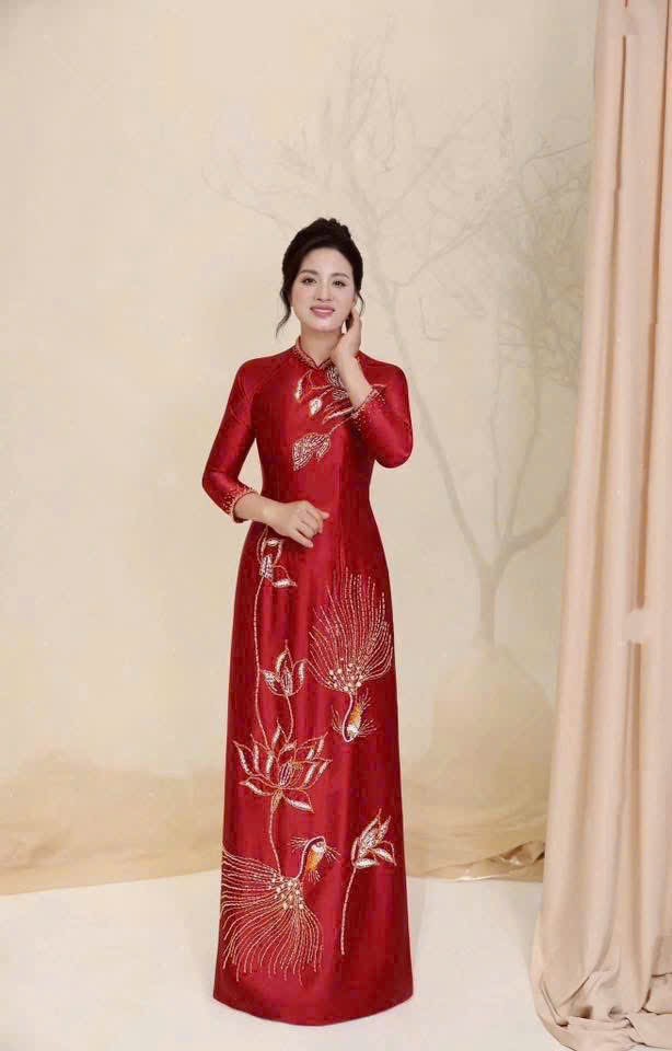Mẫu áo dài đỏ thêu chim công & hoa sen là lựa chọn lý tưởng cho bà sui yêu thích phong cách sang trọng – ý nghĩa – nổi bật đúng mực, góp phần hoàn thiện hình ảnh trang nghiêm và phúc lộc trong ngày trọng đại.