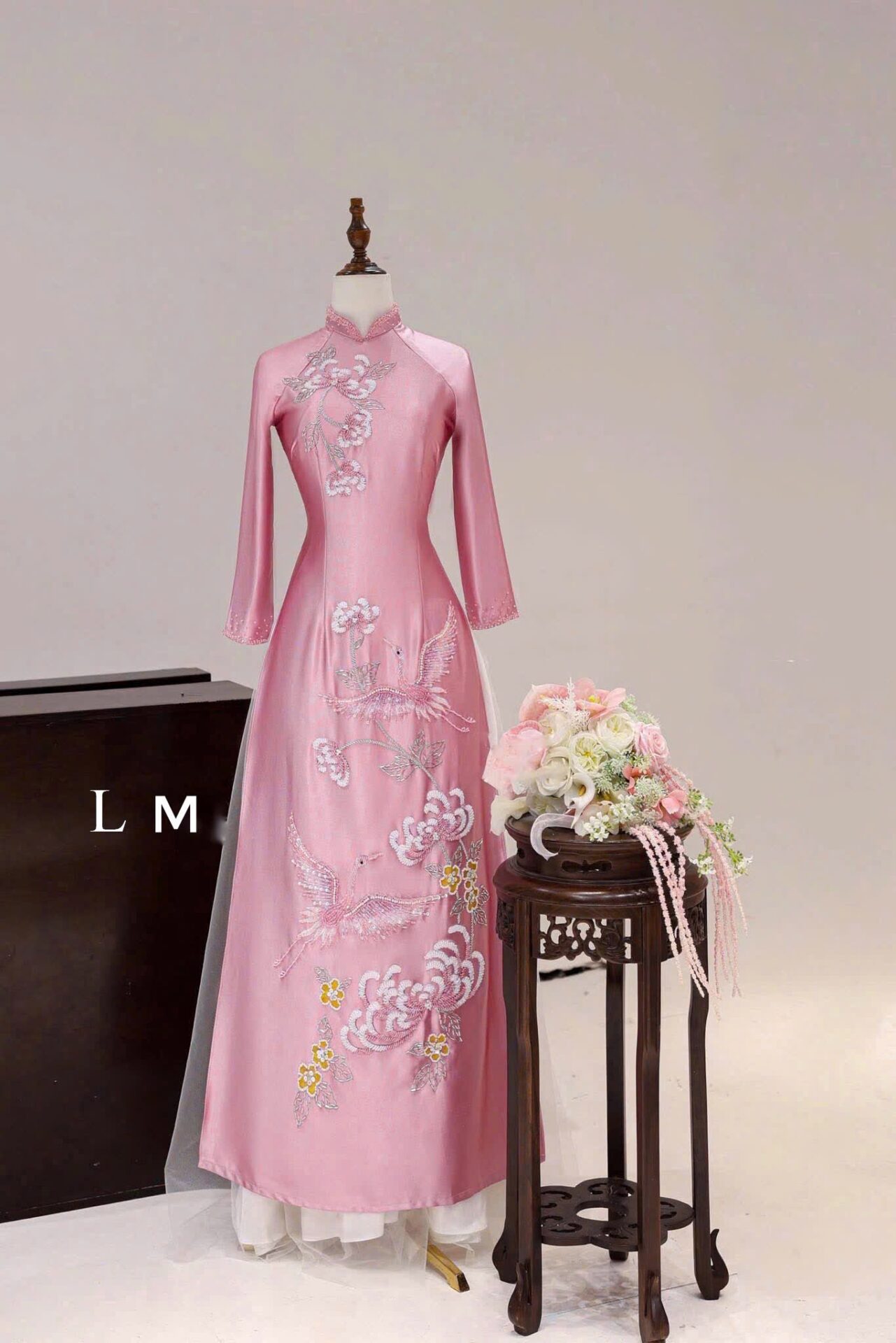 Áo dài bà sui màu hồng phấn dịu ngọt, chất liệu lụa cao cấp, thêu chim hạc và hoa đào tinh xảo, mang ý nghĩa phúc lành – hạnh phúc – viên mãn, lý tưởng cho lễ cưới hỏi trang trọng.