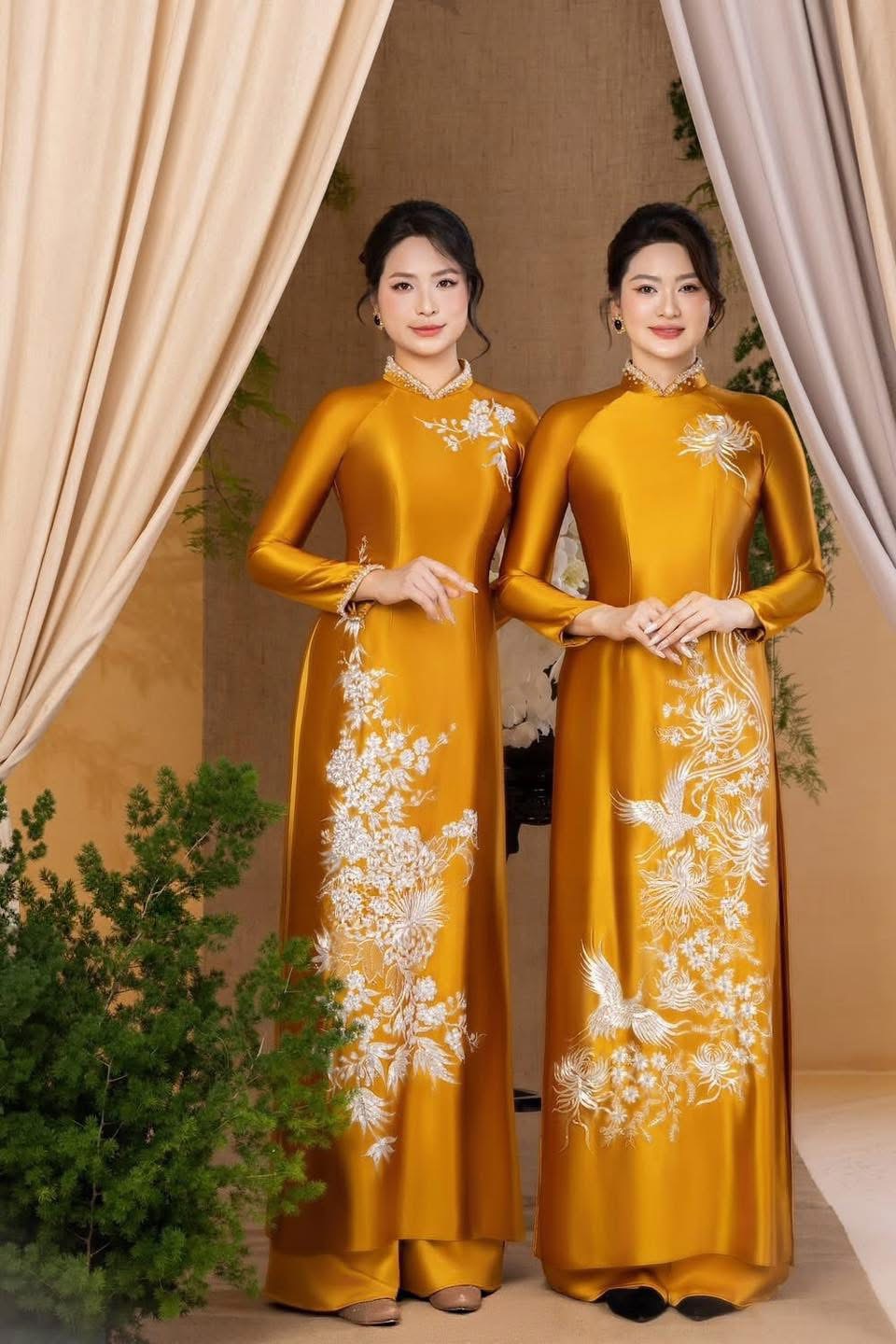 Áo dài bà sui lụa vàng hoàng kim thêu hoa – hạc là lựa chọn hoàn hảo cho những gia đình yêu cầu sự sang trọng, đồng bộ và đúng chuẩn lễ nghi, góp phần tôn vinh hình ảnh người mẹ, người sui phúc hậu – quyền quý – đầy khí chất trong ngày vui trọng đại.