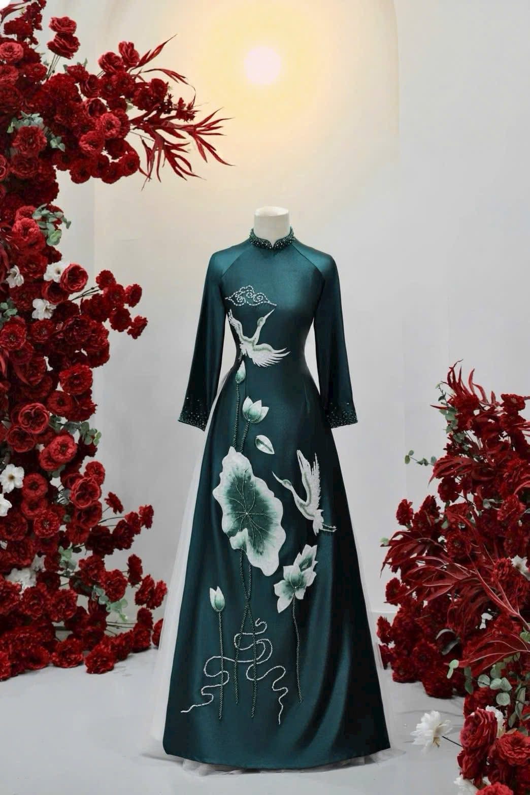 Áo dài bà sui màu xanh ngọc đậm sang trọng, chất liệu lụa cao cấp, thêu hạc bay kết hợp hoa sen tinh xảo, biểu trưng cho phúc lộc – trường thọ – viên mãn, phù hợp các nghi lễ cưới hỏi trang trọng.