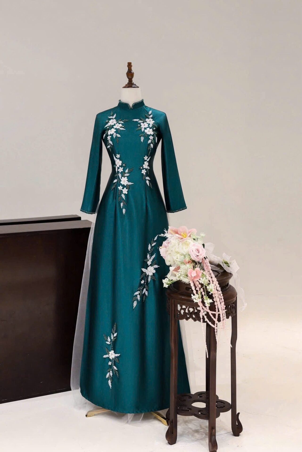 Gam màu xanh ngọc trầm tạo cảm giác dịu dàng, nền nã và quý phái, rất phù hợp với độ tuổi bà sui. Họa tiết hoa trắng thêu tay tinh tế được bố trí khéo léo từ thân trên kéo dài xuống tà áo, tạo hiệu ứng thon gọn vóc dáng và mang ý nghĩa thuần khiết – hòa thuận – phúc lộc viên mãn.