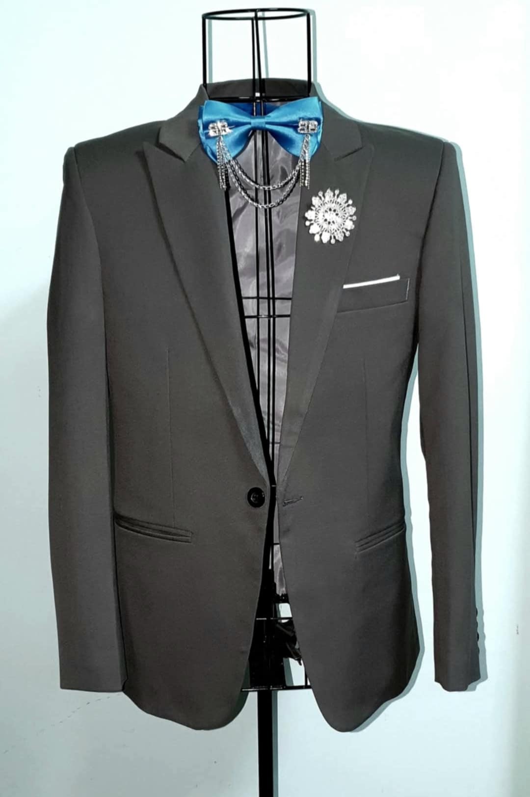 • Một số mẫu được nhấn nhá bằng khuy kim loại, ghim cài áo, nơ cưới đính đá hoặc dây xích trang trí, tạo điểm nhấn nổi bật cho chú rể