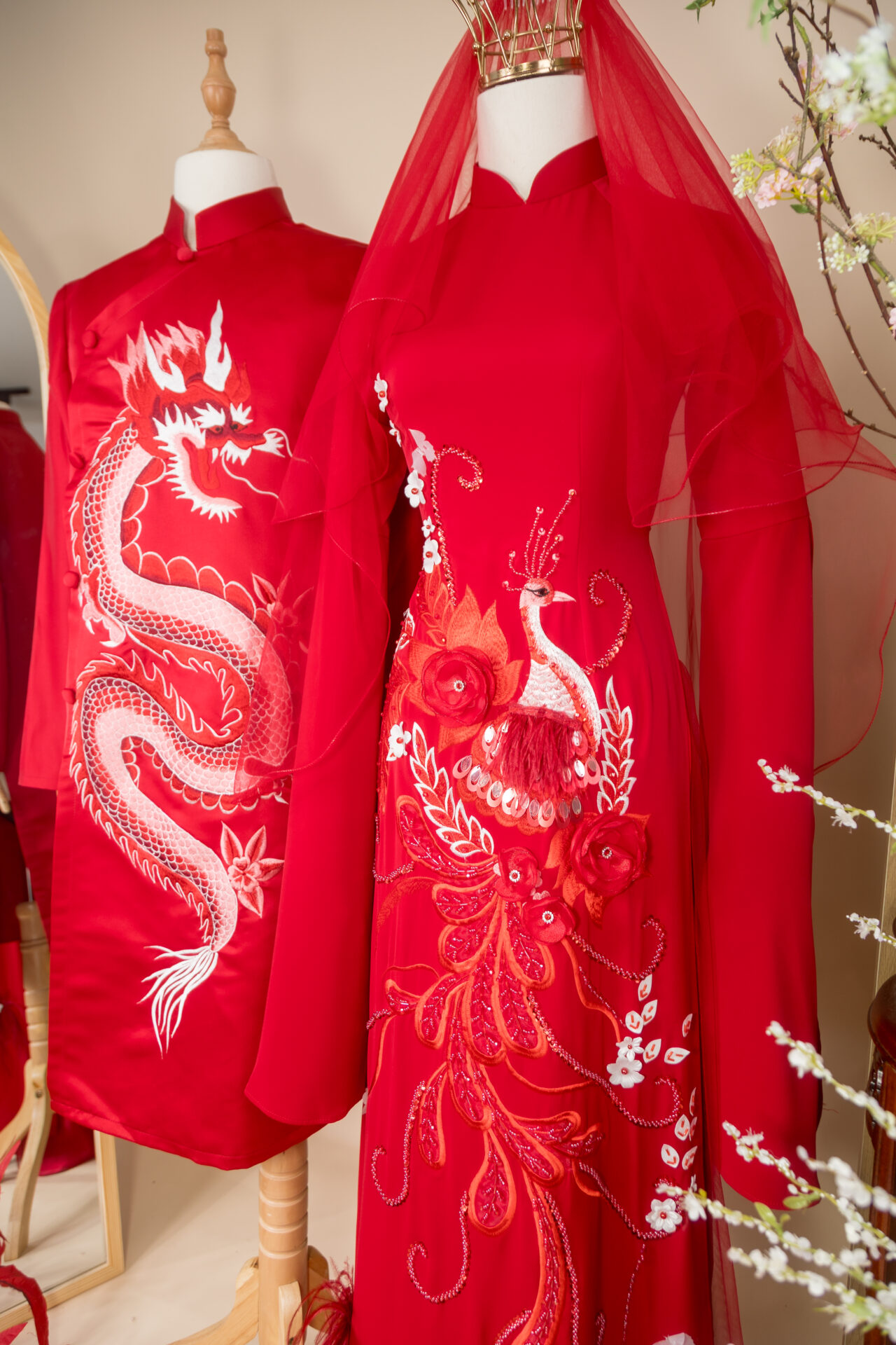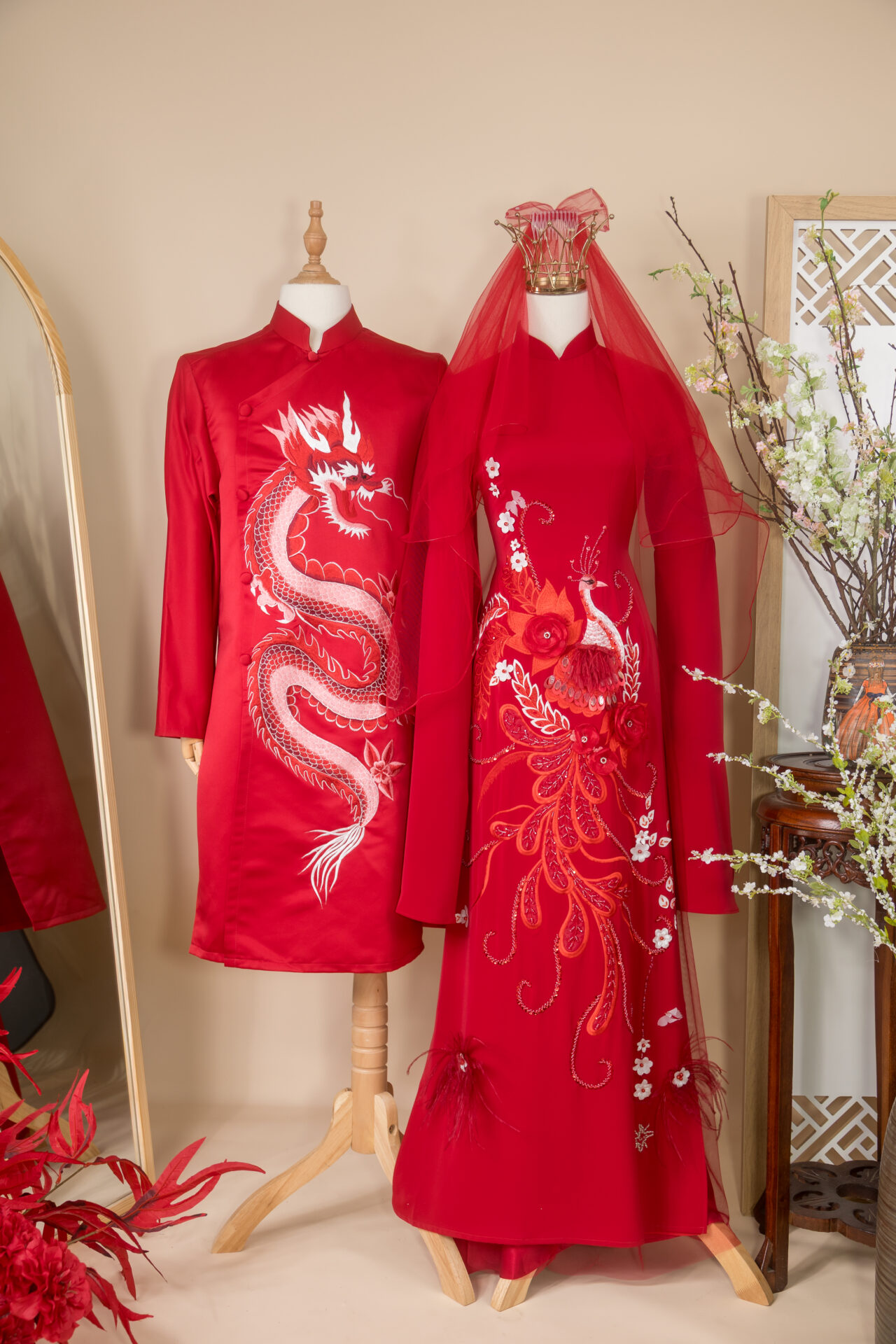 Cặp áo dài mang sắc đỏ rực rỡ – gam màu biểu tượng cho hỷ sự, may mắn và thịnh vượng trong lễ cưới truyền thống Việt Nam. Thiết kế nổi bật với hình tượng Long – Phụng, biểu trưng cho sự hòa hợp, quyền quý và hạnh phúc viên mãn của đôi uyên ương.