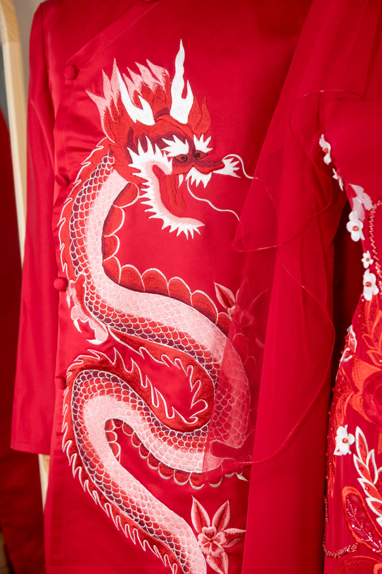 Nổi bật với hình rồng lớn uốn lượn được thêu và đính kết sắc sảo bằng hai tông đỏ – trắng, tạo hiệu ứng nổi bật mạnh mẽ.