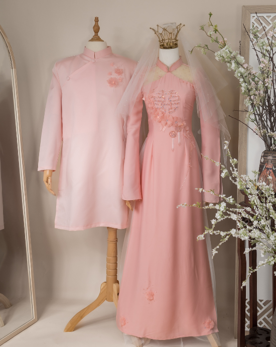Kiểu dáng truyền thống pha hiện đại giúp tôn dáng cho cô dâu và mang lại sự sang trọng, lịch lãm cho chú rể. Bộ áo dài này đặc biệt phù hợp cho lễ ăn hỏi, chụp ảnh cưới hoặc lễ rước dâu, mang lại vẻ đẹp thanh thoát, ngọt ngào nhưng vẫn đầy trang trọng.