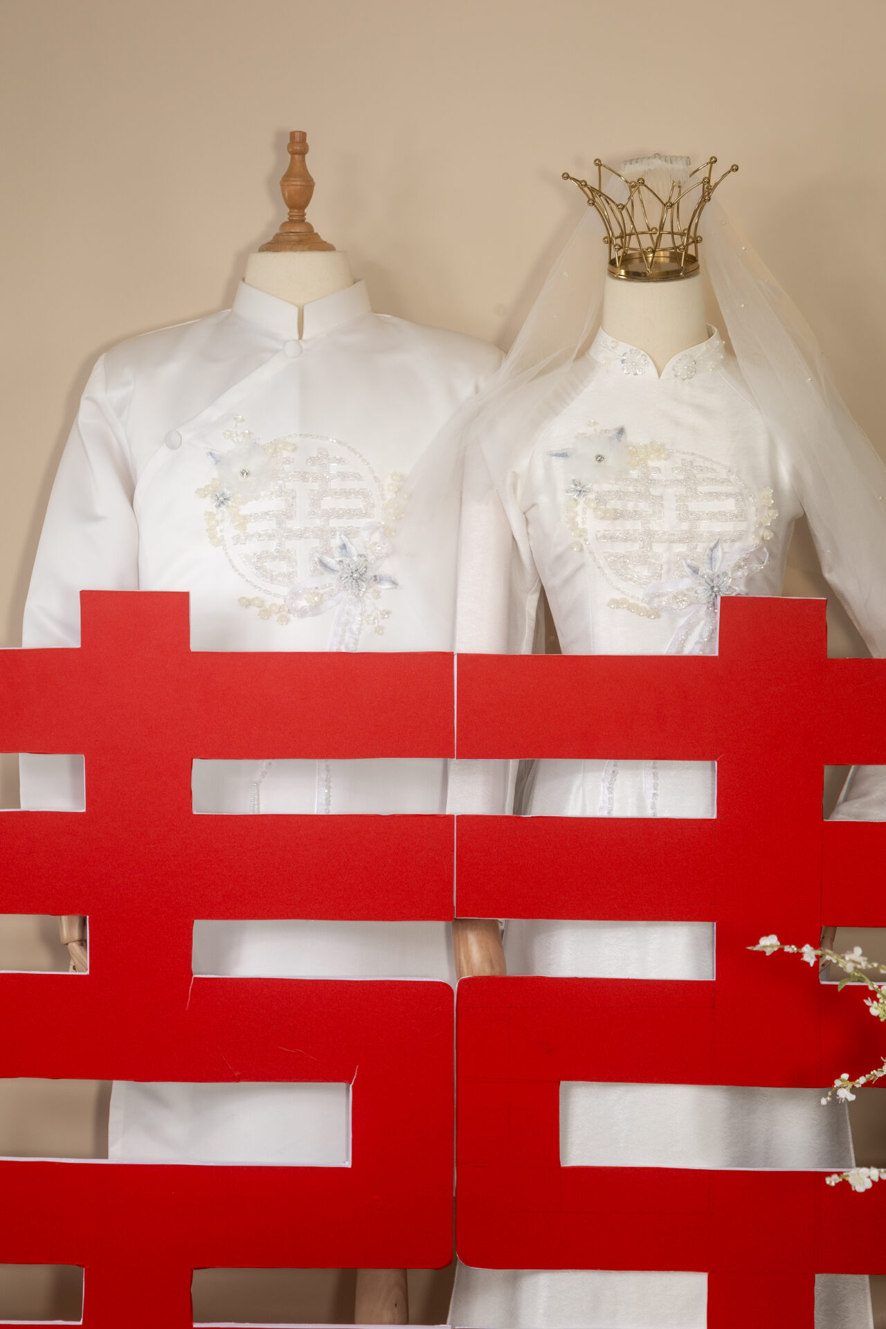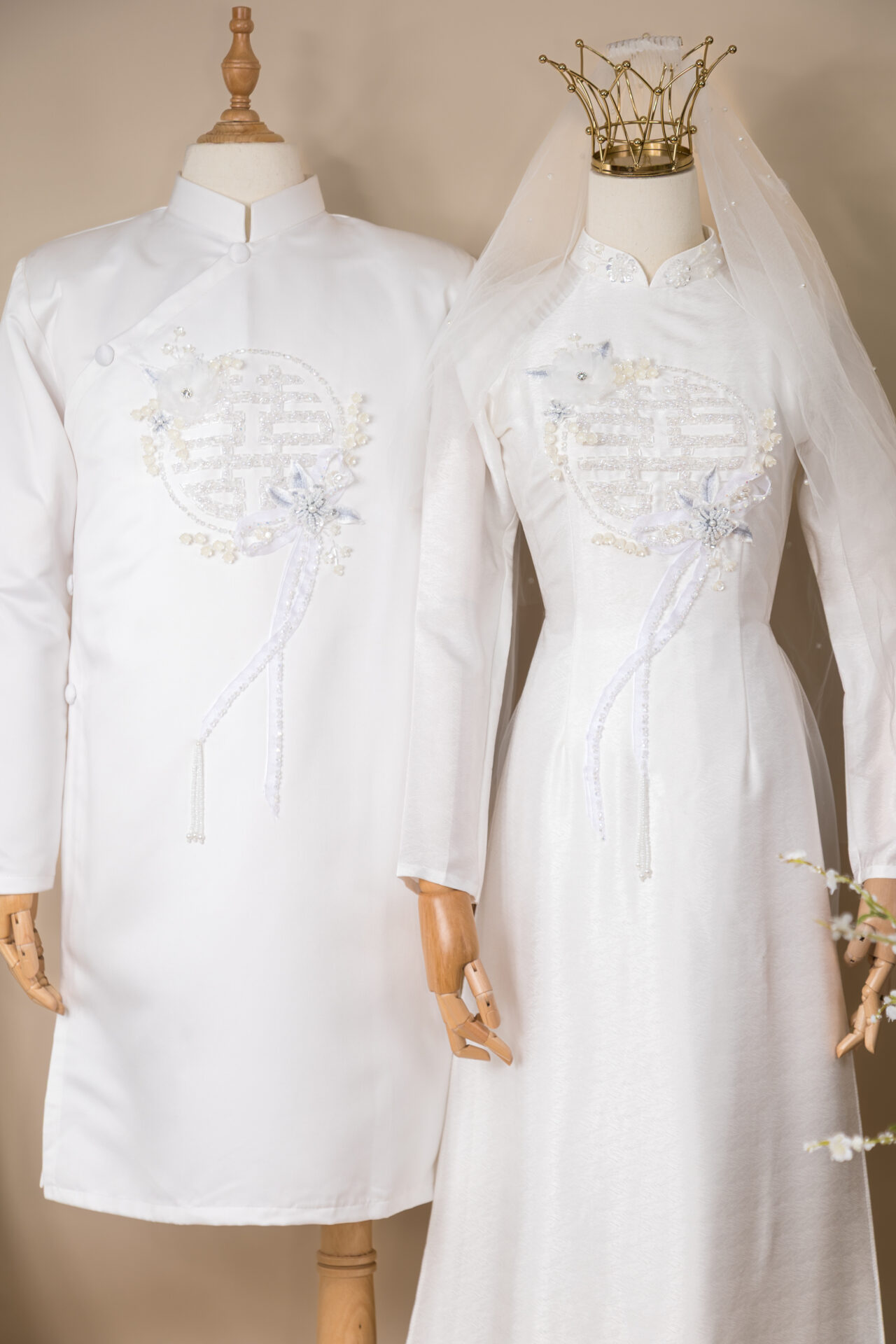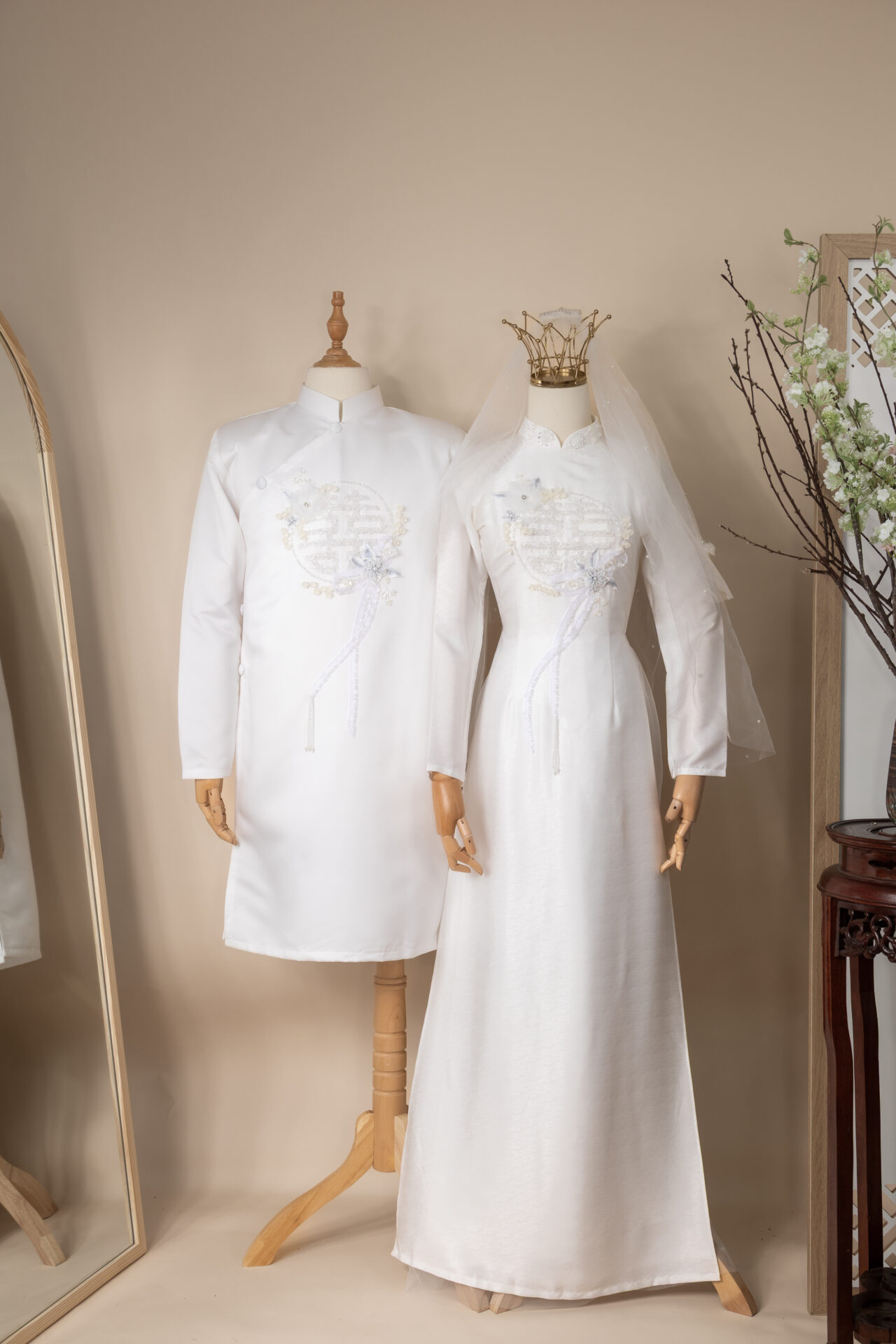 Cặp áo dài trắng tuyết hỷ là bộ áo dài cưới đôi với sắc trắng tinh khôi, thiết kế tối giản nhưng sang trọng, nổi bật họa tiết “Song Hỷ” tượng trưng cho hạnh phúc trọn vẹn, thường may bằng chất liệu lụa cao cấp mềm mại (tafta, gấm hoa tuyết), giúp tôn dáng thanh lịch cho cô dâu chú rể trong ngày trọng đại, dễ dàng phối phụ kiện.