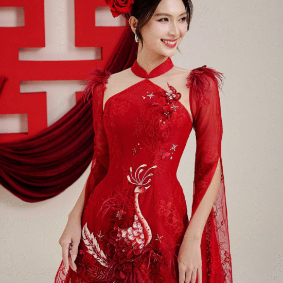 Chi tiết thêu hoa uyên ương và chữ hỷ được xử lý tỉ mỉ, mang ý nghĩa cầu chúc cho hạnh phúc lứa đôi bền lâu và viên mãn. Đây là lựa chọn lý tưởng cho lễ cưới, lễ đính hôn hoặc chụp ảnh cưới — nơi sự tinh tế và trang trọng hòa quyện hoàn hảo.