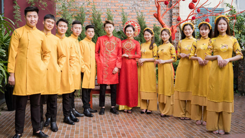 Áo dài bưng quả màu trắng không chỉ thể hiện sự tinh tế mà còn tôn vinh nét đẹp thuần khiết của buổi lễ cưới. Năm 2025, những mẫu áo dài trắng tối giản, nhẹ nhàng và đồng bộ chắc chắn sẽ tiếp tục là lựa chọn hoàn hảo cho mọi cặp đôi.